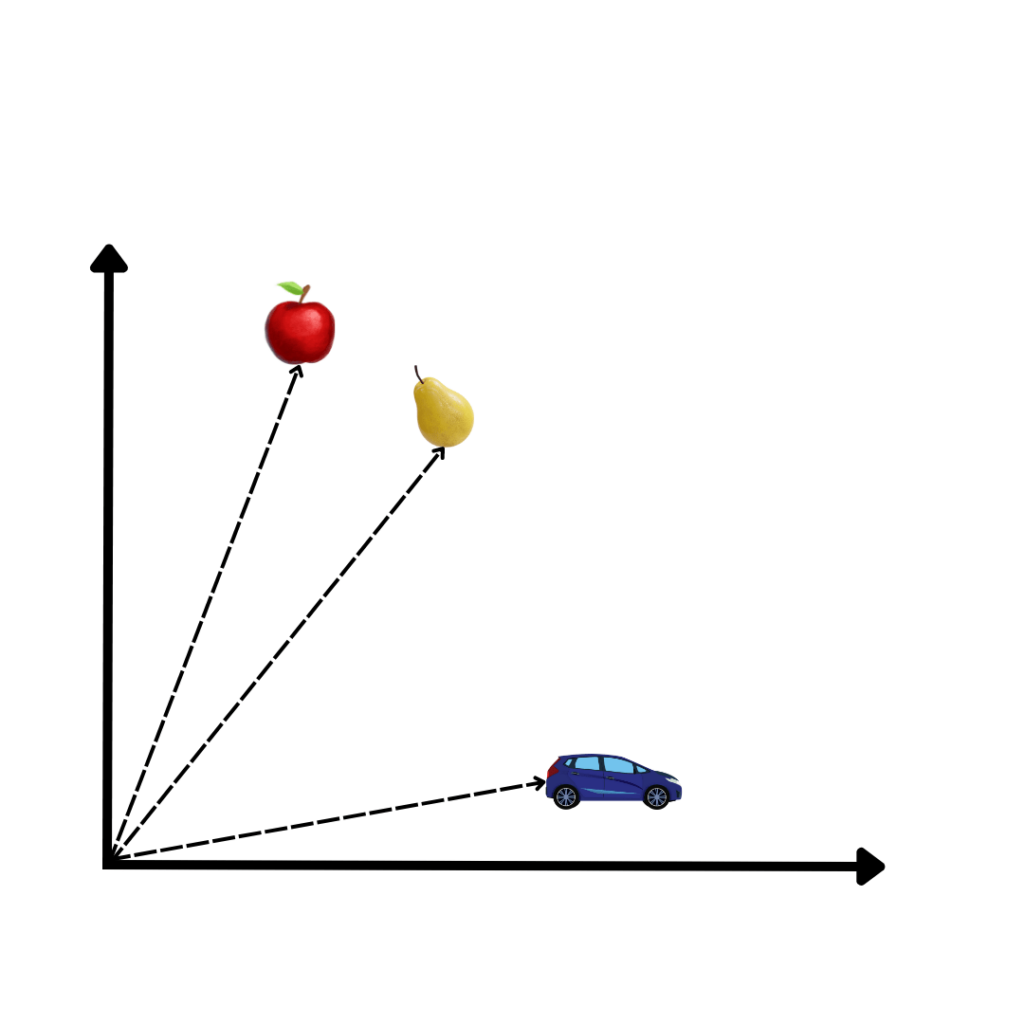 Die wahre Schönheit dieser Embeddings liegt in ihrer Fähigkeit, Information abstrakt darzustellen. Sie nehmen jeden Aspekt eines Textes und transformieren ihn in mathematische Vektoren, die für Maschinen verständlich sind. Der Abstand zwischen zwei Vektoren (Siehe Grafik) misst ihre Verwandtschaft. Kleine Entfernungen deuten auf eine hohe Verwandtschaft hin, große Entfernungen auf eine geringe Verwandtschaft. Dabei sind Embeddings das Geheimnis hinter der erstaunlichen Fähigkeit von LLMs, Texte zu verstehen und entsprechend zu verarbeiten.